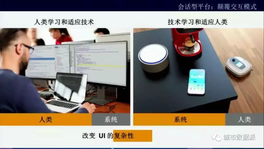下面講會話型平臺,或者會話型系統(tǒng)。我們現(xiàn)在人和系統(tǒng)交互的交互方式要發(fā)生改變。比如現(xiàn)在用PC機的時候,人和系統(tǒng)的交互是用鍵盤、鼠標(biāo)交互,我們現(xiàn)在有手機了,人和系統(tǒng)交互是通過觸摸屏交互,但是未來,我的眼鏡是我的設(shè)備,我的手環(huán)是我的設(shè)備,出門一輛汽車是我的設(shè)備,一個屏幕是我的設(shè)備,家里可能有500個設(shè)備,我要學(xué)會和這些系統(tǒng)進行交互,學(xué)習(xí)成本很高,怎么樣降低學(xué)習(xí)成本?