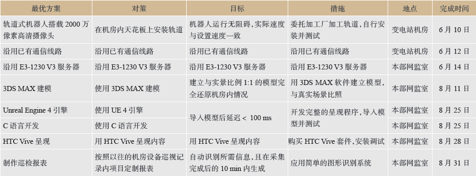 根據(jù)以往的機房設(shè)備巡視記錄表,需要巡視的內(nèi)容都是標準數(shù)字的示數(shù)、紅黃綠燈等可簡單圖像識別的數(shù)據(jù),使用簡單的圖像處理系統(tǒng)識別之后,系統(tǒng)可以自行制作電子數(shù)據(jù)報表并存檔。根據(jù)確定的最佳方案,制訂了詳細的方案實施對策表(見表2)。
