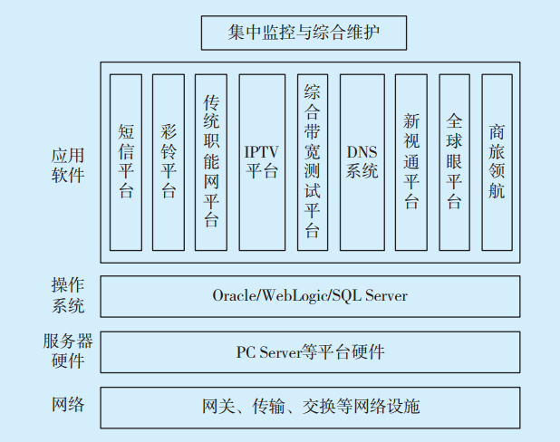 [13]運(yùn)行監(jiān)視、配置管理、調(diào)度協(xié)調(diào)、資源分配、故障處理均由總部負(fù)責(zé),省級(jí)機(jī)構(gòu)負(fù)責(zé)本地接入網(wǎng)設(shè)備的維護(hù),并配合總部開(kāi)展設(shè)備基礎(chǔ)環(huán)境維護(hù)等現(xiàn)場(chǎng)工作。