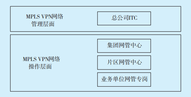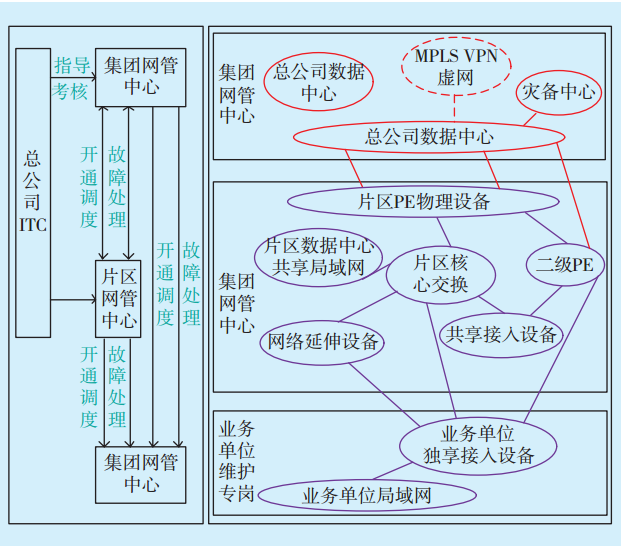 該企業(yè)集團(tuán)的MPLS VPN網(wǎng)絡(luò)運(yùn)維體系的組建以總公司、二級(jí)單位等行政管理歸屬為基本單元,采用運(yùn)維管理集中、運(yùn)維操作分散的模式:總公司ITC負(fù)責(zé)統(tǒng)一的運(yùn)維管理;集團(tuán)網(wǎng)管中心、片區(qū)網(wǎng)管中心和業(yè)務(wù)單位網(wǎng)管專(zhuān)崗分別按照所屬層級(jí)進(jìn)行具體的維護(hù)工作。