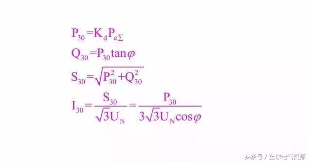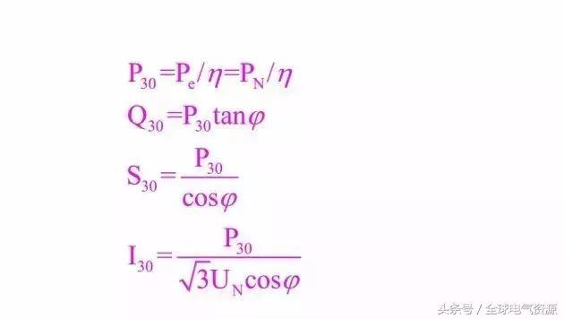 當只有一臺用電設備時,不能直接按表取需要系數(shù),這是因為影響需要系數(shù)的幾個因素除用電設備本身的效率η外均可能為1,此時的需要系數(shù)只包含了效率η,因此可得到P30 =Pe /η,由P30 、Q30 、S30 、I30 之間的關系得到如下公式: