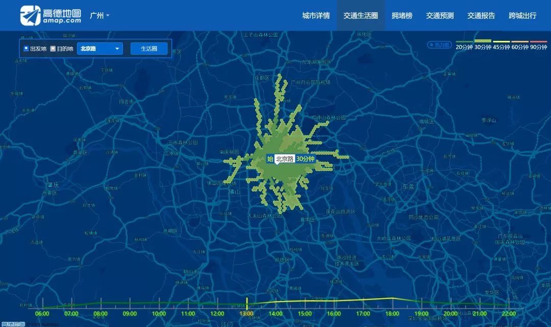 2)交通生活圈,通過高德地圖交通大數(shù)據(jù),我們可以輕松從網(wǎng)站上面,查出我國各大城市地標(biāo)建筑在20、30、45、60、90分鐘內(nèi),可以到達(dá)的地方,例如如果選擇了廣州的北京路作為出發(fā)地,30分鐘內(nèi)可達(dá)到的地區(qū),如下圖所示: