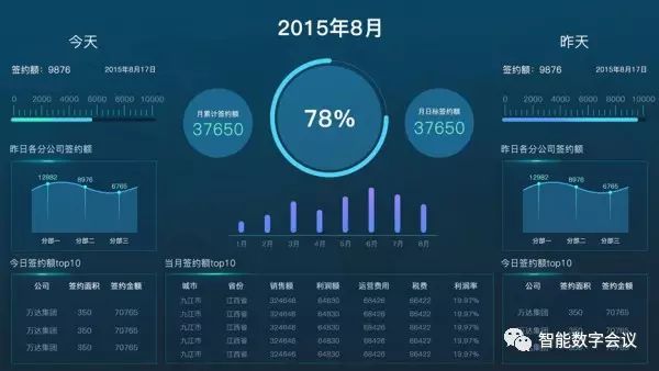如下圖所示銷售駕駛艙大屏,頂部的標(biāo)題通過左右兩個對稱線條進(jìn)行點綴,各個組件的細(xì)分標(biāo)題通過不規(guī)則漸變色圖片進(jìn)行點綴,另外每個組件都搭配使用了簡潔的邊框以提升層次感。
