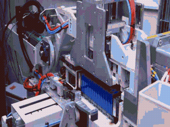 將電芯傳送到制定位置,機(jī)械手自動(dòng)抓取送入模組裝配線。