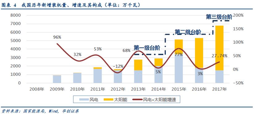 我國風(fēng)電、光伏年新增裝機總量已經(jīng)進入到“第三級臺階”。從2013年,我國光伏裝機進入規(guī)模化發(fā)展開始,我國風(fēng)電、光伏的新增發(fā)電裝機容量,歷了三個臺階。第一級是2013、2014年,光伏、風(fēng)電裝機量各有漲跌,但總量均逼近30GW。第二季臺階是2015、2016年,風(fēng)電、光伏先后搶裝,兩年的新增裝機總量均突破50GW。2017年,中東部地區(qū)分布式光伏裝機量大幅提高,風(fēng)電+光伏裝機總量逼近70GW,裝機總量達到“第三級臺階”,在新增裝機中的占比已達到50.9%。