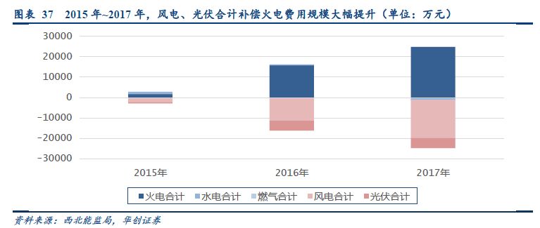 我們認為,2017年在“三北”地區(qū)新能源新增裝機量基本維持2015、2016年的水平,但是棄電率惡化的態(tài)勢在2017年得到了有效的遏制,2018年棄電率回歸到了2014年的水平。其主要原因在于2014~2016年,東北、西北地區(qū)分別在電力輔助服務(wù)機制上做出了巨大的調(diào)整。這些調(diào)整極大地緩和了在目前“兩軌制”下,新能源、火電的發(fā)電權(quán)利益沖突。更進一步,火電機組在調(diào)峰服務(wù)的收益性得到了提升,從而促進了東北、西北地區(qū)火電廠參與調(diào)峰的積極性,帶動電力系統(tǒng)調(diào)節(jié)能力的大幅提升。