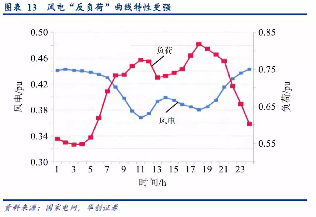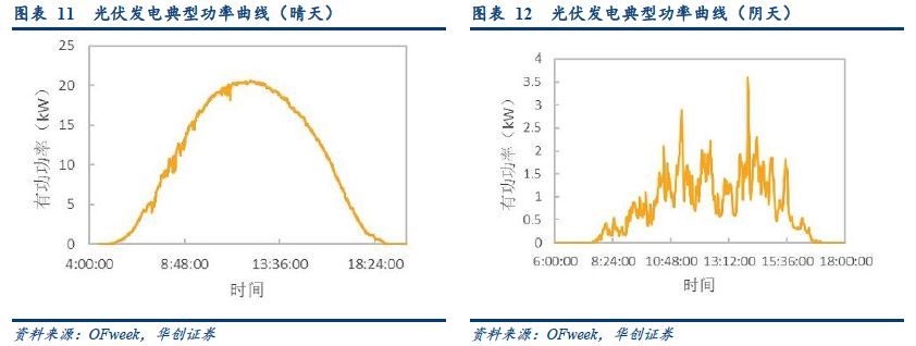 風(fēng)電“反負荷”特性強,光伏波動性更大。從擬合負荷曲線的角度看,在內(nèi)陸日內(nèi)風(fēng)資源更多的集中在夜晚,因此風(fēng)電的“反負荷”特性更為明顯。而光伏的日發(fā)電曲線(夜晚為零,正午最高的山峰狀曲線),與負荷曲線的擬合度更高。但是,光伏的光照資源在多云、陰天的時刻,發(fā)電短時波動更大。