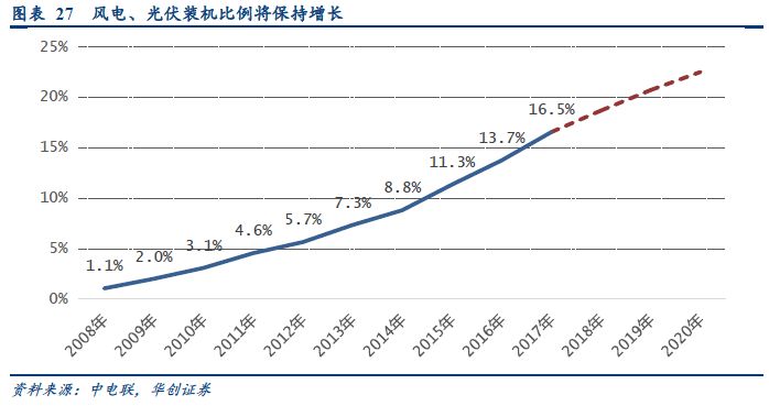 非水可再生能源發(fā)電比例快速提高,從2009年的1.06%上升至2017年的16.54%。2009年,我國僅有風(fēng)電裝機17.6GW,太陽能發(fā)電裝機0.25GW,在總裝機量中占比僅為1.06%。2017年底,風(fēng)電、光伏合計裝機達到294GW,占比總裝機量的16.54%。從裝機總量來看,2009年底至今,風(fēng)電、光伏裝機量增長了約276GW,占全部新增裝機量903GW的31.7%,占比目前風(fēng)電光伏總裝機量的97.3%。