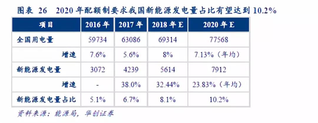 2020年,非水可再生能源發(fā)電量占比有望達到10.2%。2017年,我國用電總量63,086萬億千瓦時,其中新能源發(fā)電量4239萬億千瓦時,占比6.7%。以各省2017年的用電量為基礎(chǔ),按照2018年的配額指標(biāo)計算,全國總的指標(biāo)為8.1%;按照2020年的配額指標(biāo)計算,全國總的指標(biāo)為10.2%。我們假設(shè)2020年,我國非水可再生能源在全部用電量中的占比為10.2%,則2020年新能源發(fā)電量應(yīng)達到7912億千瓦時。