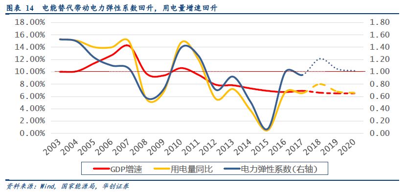 從電力消費彈性系數(shù)來看(用電量增速與GDP增速比值),在經(jīng)過了2015年的增速低谷后,隨著供給側(cè)改革、電能替代等因素,2016年開始用電增速逐步恢復(fù)。在煤改電、新能源汽車、供給側(cè)改革等重大產(chǎn)業(yè)發(fā)展變化、政策引導(dǎo)下,我國終端電力消費在能源消費中的比例正在逐步提升。2017年,全社會用電量增量達到3905億千瓦時,其中電能替代電量超過1200億千瓦時,電能替代對用電量增量貢獻超過了30%。