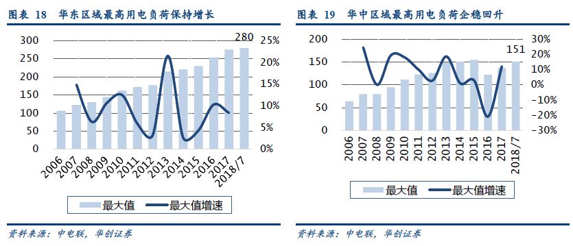 我國主要電網(wǎng)的最高用電負荷快速提高。2017年7月,我國主要電網(wǎng)的合計最大用電負荷達到了926GW,同比增長7.8%,除華中電網(wǎng)外,其他區(qū)域均創(chuàng)歷史新高,繼續(xù)維持5~10%的增速。2018年7月,全國主要電網(wǎng)的合計最大用電負荷達到993GW,同比增長7.2%,再創(chuàng)歷史新高。