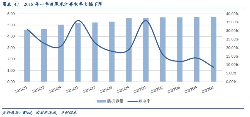 黑龍江輔助服務(wù)助力,棄電率大幅下降27個百分點。從能源局公布的數(shù)據(jù)看,2018年一季度黑龍江的棄風(fēng)率僅為8.5%,而去年同期為36%,同比大幅下降27.5個百分點。黑龍江電網(wǎng)引導(dǎo)火電企業(yè),調(diào)峰輔助服務(wù)使得風(fēng)電消納電量增加了10.6億千瓦時,占比今年風(fēng)電新增發(fā)電量的61%。同時,東北地區(qū)的風(fēng)電棄電率進一步下降,遼寧、吉林、黑龍江棄電率分別下降到2.4%、8.1%、8.5%,而去年同期這一數(shù)字分別為15%、44%、36%。