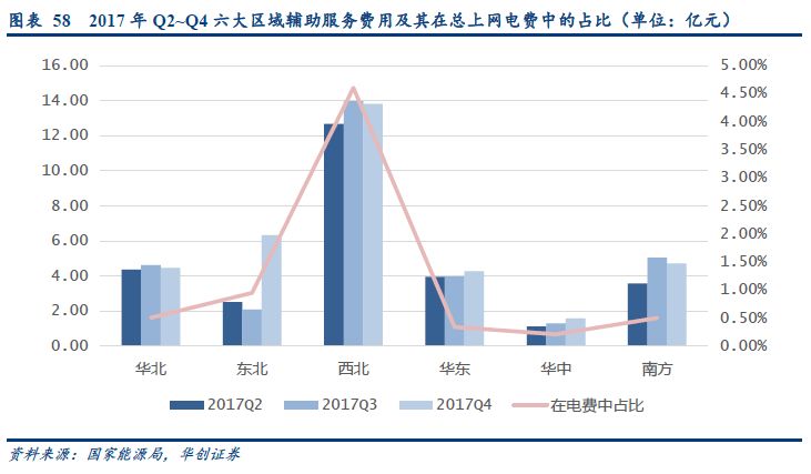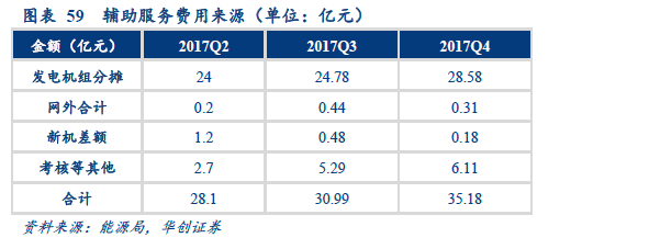 2017年11月開始,國家能源局先后公布了2017年第二、第三、第四季度的全國輔助服務(wù)補償情況通報,除西藏、蒙西地區(qū)外的30個省均已建立起了電力輔助服務(wù)機制。補償費用在上網(wǎng)電費比例達到了0.7~0.8%左右,我們估計目前全國每年的電力輔助服務(wù)補償費用在110~125億元之間。