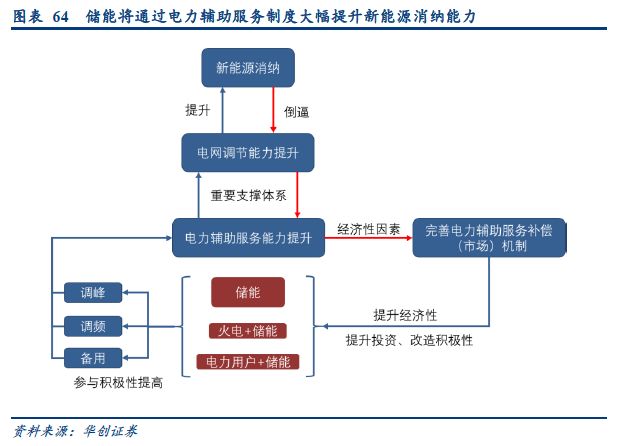我們認為,電力輔助服務(wù)就是儲能參與電網(wǎng)調(diào)節(jié)的制度基礎(chǔ),因為輔助服務(wù)的補償機制就是對電網(wǎng)調(diào)節(jié)行為的補償制度。市場化的輔助服務(wù)體系,在定價、資源調(diào)用兩個方面解決了電網(wǎng)與儲能的互動規(guī)則。無論是輔助服務(wù)還是電網(wǎng)側(cè)儲能,在市場化的輔助服務(wù)補償體系下,參與到電網(wǎng)調(diào)節(jié)后都將獲得給予合理的補償,擺脫原有的依靠用戶側(cè)電價差套利的制度依賴。