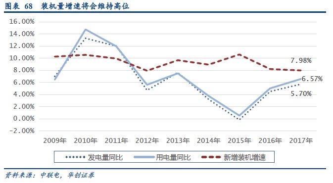 首先,我國用電量正在進入一輪經(jīng)濟增長疊加電能替代帶動下的快速增長通道,未來三年的負荷增速在7.5%以上。同時,電網(wǎng)最大負荷也將以6%~8%左右的增速保持增長,裝機需求仍然較大??紤]到風(fēng)電、光伏的平均負荷率較火電低40%以上,同等用電量下的裝機量將遠高于火電裝機。整體來看,我國未來三年將保持120GW左右年均新增發(fā)電裝機量。而考慮到配額制的約束,新能源年均新增裝機量也將有望保持70GW左右的水平。