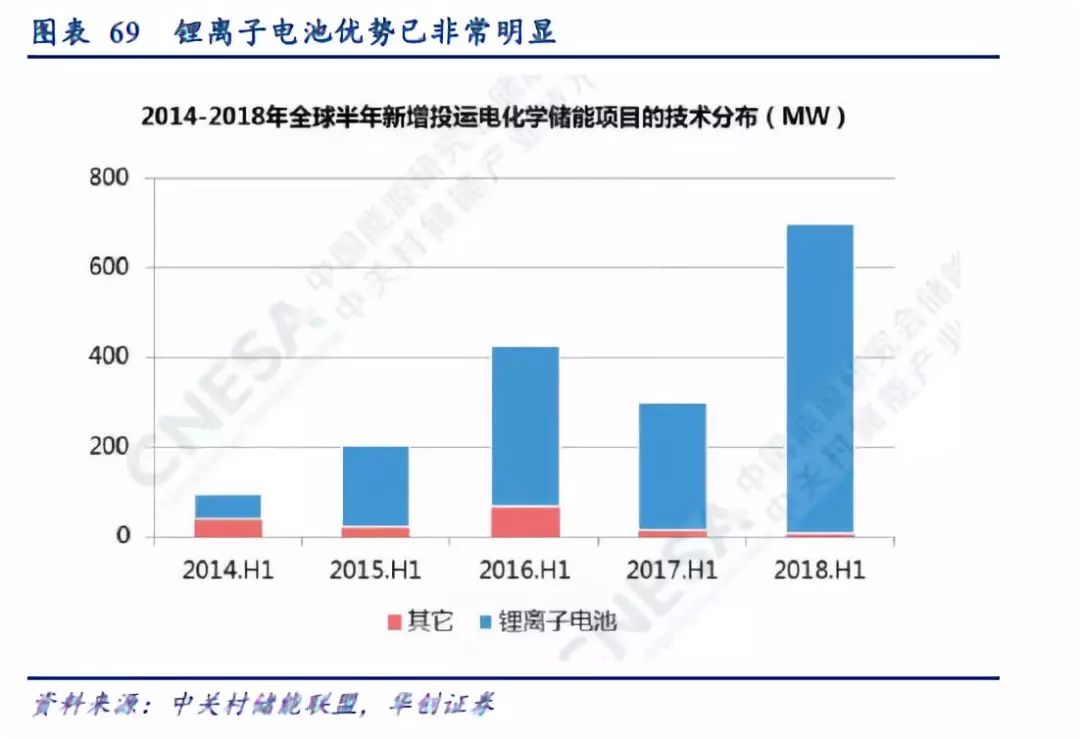 電網(wǎng)側(cè)、輔助服務(wù)領(lǐng)域儲能爆發(fā),對鋰離子電池需求的邊際帶動快速提高。根據(jù)中關(guān)村儲能產(chǎn)業(yè)技術(shù)聯(lián)盟的統(tǒng)計,2018年上半年,全球新增的697MW電化學(xué)儲能裝機中,幾乎全部為鋰離子電池。同時,輔助服務(wù)已成為全球最主要的電化學(xué)儲能應(yīng)用領(lǐng)域,達到354MW,占比51%,同比增長344%,并且全部為鋰離子電池,電網(wǎng)側(cè)儲能裝置也全部為鋰離子電池。上半年,我國電化學(xué)儲能項目新增裝機量達到100.4MW,同比增長127%,累計裝機規(guī)模達到490MW。其中,超過六成項目為電網(wǎng)級的電網(wǎng)側(cè)、輔助服務(wù)領(lǐng)域儲能,并且全部為鋰離子電池。
