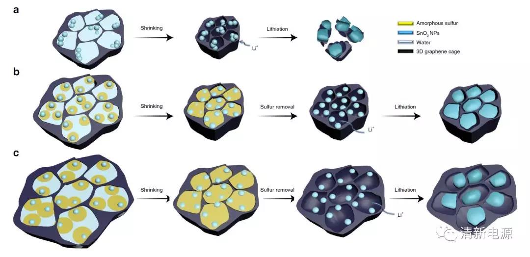 在目前引入預(yù)留空間的方法中,主要采用犧牲性模板如Si模板,Ni模板、PS球模板,鹽模板等,這些模板無論是原位還是非原位引入,最終都很難同非碳組分很好地結(jié)合且大多是形狀模板,引入的空隙為模板形狀導(dǎo)向,因此很難獲得合適的預(yù)留空間。硫模板法的提出,是在三維石墨烯致密網(wǎng)絡(luò)中,不僅利用其易去除的優(yōu)勢,更為重要的是利用硫如同“變形金剛”一樣的可塑形的特點,在碳籠結(jié)構(gòu)內(nèi)部實現(xiàn)對非碳活性顆粒如SnO2納米顆粒的緊密包覆。與傳統(tǒng)的形狀模板相比,硫模板的最大優(yōu)勢就是能發(fā)揮體積模板的作用,使緊致的石墨烯籠結(jié)構(gòu)能夠提供適形且大小合適的預(yù)留空間,最終完成對活性SnO2顆粒的“量體裁衣”。SnO2作為模型材料,能夠很好的詮釋可塑形硫模板的方法學(xué),同時該方法已推廣至硅及其他非碳電極,對于豐富非碳電極設(shè)計思想具有重要的啟發(fā)意義。