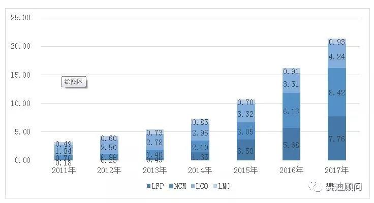 2011年—2017年全球鋰電正極材料銷量(萬噸)