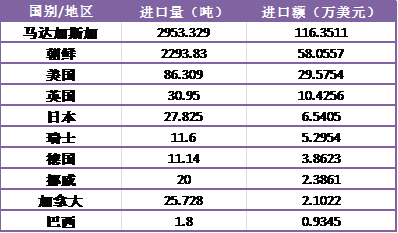 2017年中國鱗片天然石墨進(jìn)口額前10名的國家或地區(qū)