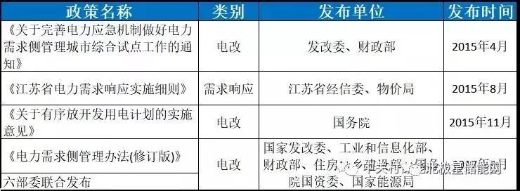 結(jié)合新一輪電力體制改革以及配套文件的發(fā)布,輔助服務(wù)和電力需求側(cè)管理(需求響應(yīng))領(lǐng)域出臺的一系列政策都為儲能參與電力系統(tǒng)的服務(wù)提供依據(jù)和支持。這些政策對于提升儲能在輔助服務(wù)和用戶側(cè)應(yīng)用的經(jīng)濟(jì)性有較大的作用,政策制定與市場發(fā)展形成了良性的互動(dòng)。下邊兩個(gè)表對相關(guān)政策進(jìn)行了梳理和總結(jié)。