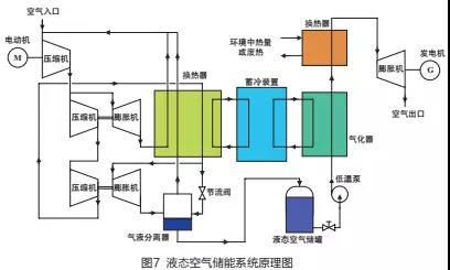 液態(tài)壓縮空氣儲能是將電能轉(zhuǎn)化為液態(tài)空氣的內(nèi)能以實現(xiàn)能量存儲的技術(shù)。儲能時,利用富余電能驅(qū)動電動機(jī)將空氣壓縮、冷卻、液化后注入低溫儲罐儲存;發(fā)電時,液態(tài)空氣從儲罐中引出,加壓后送入蓄冷裝置將冷量儲存并使空氣升溫氣化,高壓氣態(tài)空氣通過換熱器進(jìn)一步升溫后進(jìn)入膨脹機(jī)做功發(fā)電。由于液態(tài)空氣的密度遠(yuǎn)大于氣態(tài)空氣,其儲氣室容積可減少約20 倍,大幅壓縮系統(tǒng)占地面積,綜合成本有下降的空間。但由于系統(tǒng)增加液化冷卻和氣化加熱過程,增加了額外損耗。