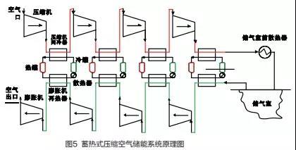 蓄熱式壓縮空氣儲能又被稱作先進(jìn)絕熱壓縮空氣儲能,其原理同絕熱壓縮空氣儲能類似,區(qū)別在于該系統(tǒng)在壓縮過程級間換熱及儲熱,絕熱壓縮空氣儲能在全部壓縮過程結(jié)束后儲熱。相較于絕熱壓縮空氣儲能,蓄熱式壓縮空氣儲能系統(tǒng)的儲熱溫度及儲能密度較低,但其壓縮機(jī)耗能減小,且對于壓縮機(jī)材料要求不高。該系統(tǒng)缺點在于增加了多級換熱及儲熱,系統(tǒng)初投資有所增加。