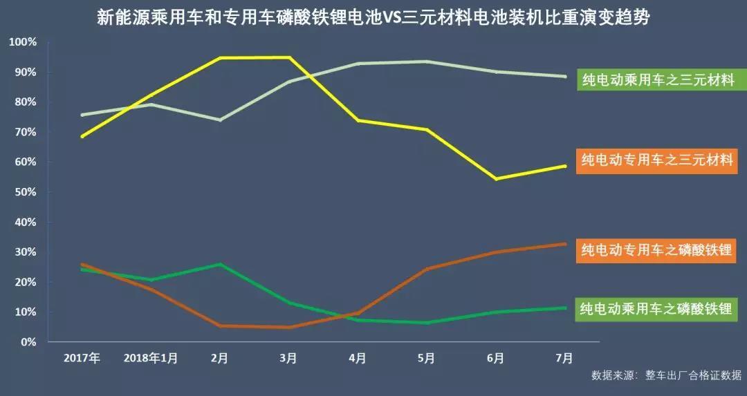 隨著補貼的退坡,企業(yè)的成本壓力增大,企業(yè)為了降低成本,更多廠家選擇了價格友好的磷酸鐵鋰電池,該類電池在新能源乘用車和專用車的裝機比重演變顯示了這一動向,尤以純電動專用車領(lǐng)域最為明顯。2017年,在高能量密度可獲高額補貼的驅(qū)使下,三元材料電池市場增長迅速。但是隨著今年補貼退坡,車企的成本收益帳要算的越發(fā)精明,磷酸鐵鋰電池的裝機比重出現(xiàn)了明顯的“逆勢增長”態(tài)勢。