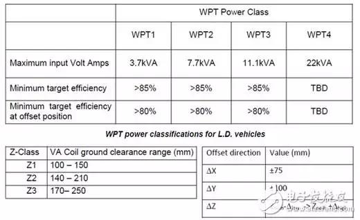 WPT(Wireless Power Transfer)系統(tǒng)可劃分為不同的功率等級(jí)。SAE J2954 TIR、IEC 61980 PT、及GB國標(biāo)征求意見稿之間均有不同。以上標(biāo)準(zhǔn)均未正式發(fā)布,以下內(nèi)容來自SAE J2954 TIR。