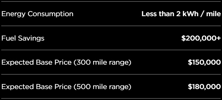 發(fā)布會(huì)提到的其他信息都可以依此類(lèi)推,例如配備Autopilot降低事故發(fā)生率以降低維修成本;基于Autopilot的車(chē)隊(duì)功能降低單位耗電量以降低充電費(fèi)用;集成車(chē)隊(duì)系統(tǒng)管理軟件降低后裝軟/硬件費(fèi)用;百萬(wàn)英里無(wú)故障承諾/去掉發(fā)動(dòng)機(jī)、變速箱、尾氣處理系統(tǒng)、差速器/配備防核爆擋風(fēng)玻璃以降低維修保養(yǎng)成本……原因只有一個(gè):降低TCO。