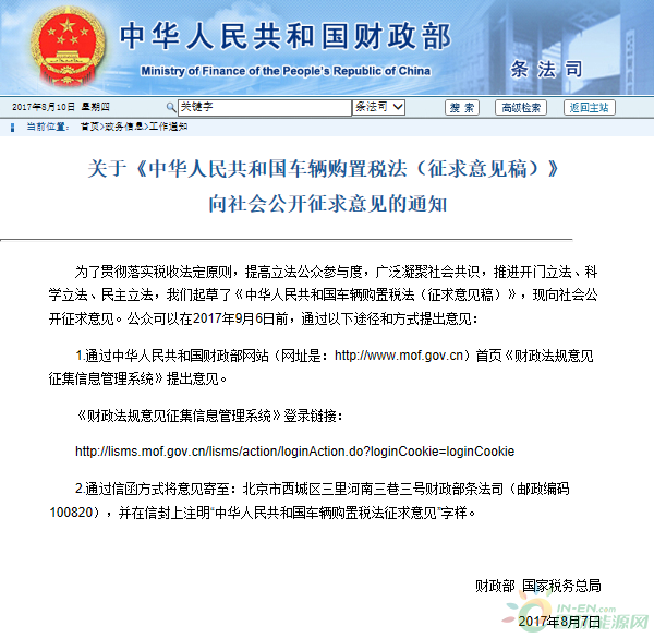 8月7日,財政部官網(wǎng)發(fā)布關(guān)于《中華人民共和國車輛購置稅法(征求意見稿)》向社會公開征求意見的通知。公眾可以在2017年9月6日前通過相應(yīng)途徑和方式提出意見。