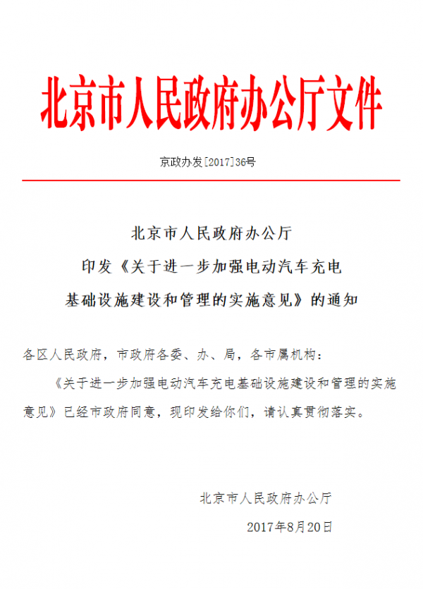 8月24日,北京市人民政府下發(fā)《關于進一步加強電動汽車充電基礎設施建設和管理的實施意見》(下簡稱《意見》)的通知,提出到2020年,形成全市平原地區(qū)平均服務半徑小于5公里的充電網(wǎng)絡,形成統(tǒng)一開放的充電服務市場,為電動汽車用戶提供安全、便捷的服務。