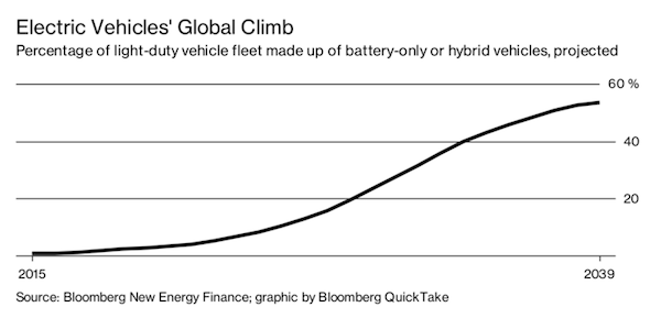 BNEF(BloombergNewEnergyFinance)曾經(jīng)預(yù)測,隨著電動汽車和插電式混合動力車在全世界范圍內(nèi)的快速增長,到2040年,新能源汽車將占全球汽車銷量的一半以上。