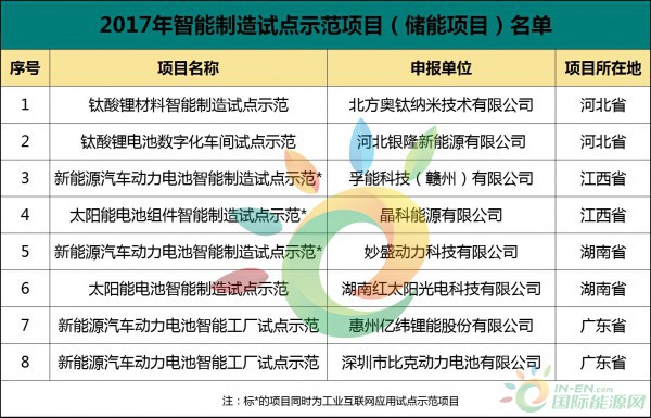 “2017年智能制造試點示范項目”名單中,入圍的儲能公司包括北方奧鈦、銀隆新能源、孚能科技、晶科能源、妙盛、紅太陽光電、億緯鋰能和比克電池。