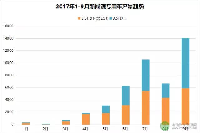 2017年前三季度,3.5T以下(含3.5T)的新能源專用車產(chǎn)銷分別完成23237臺(tái)和10814臺(tái),3.5T以上的新能源專用車產(chǎn)銷分別完成20405臺(tái)和8405臺(tái)。