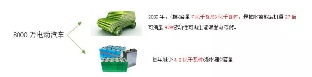 一是車載電池,按照2030年全國電動汽車保有量達到8000萬輛的預(yù)測,電動汽車每年充電需求將達到4100億千瓦時,理論儲能容量達到7億千瓦/55億千瓦時,其功率儲能的容量約為目前全國抽水蓄能裝機量的27倍。2030年風電,光伏發(fā)電電量將達到42.1億千瓦時,則僅電動乘用車的有效儲能容量即可滿足97%波動性可再生能源日發(fā)電量的存儲,如果電動汽車能夠有序充放電,則可以減少額外投資而獲得的巨大調(diào)控容量。