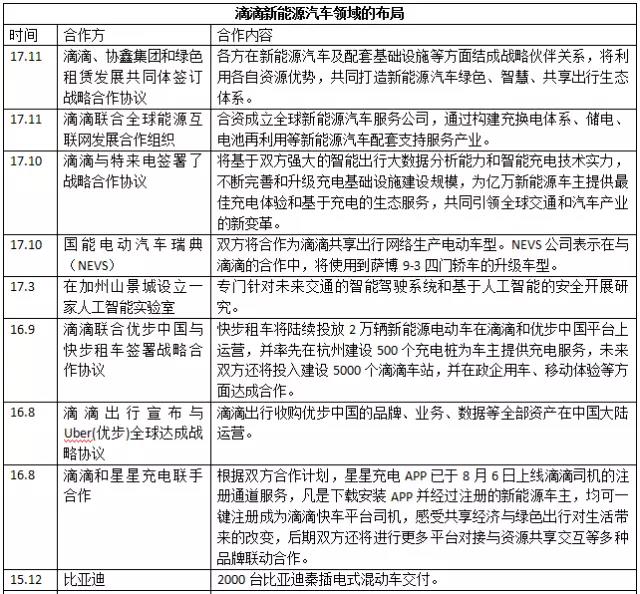 早在2014年,滴滴就與大眾汽車合作推出大眾汽車新能源車滴滴專車服務(wù)。2015年滴滴和北汽、上汽開展合作,在北京、上海等近二十個(gè)城市投放近萬輛新能源汽車。2016年9月,滴滴聯(lián)合優(yōu)步中國(guó)與快步租車簽署戰(zhàn)略合作協(xié)議,快步將陸續(xù)投放兩萬輛新能源電動(dòng)車。目前滴滴平臺(tái)上已有比亞迪、奇瑞、長(zhǎng)安和北汽等多個(gè)品牌的新能源汽車,并持續(xù)推動(dòng)新能源汽車在整個(gè)運(yùn)營(yíng)體系當(dāng)中的占比。