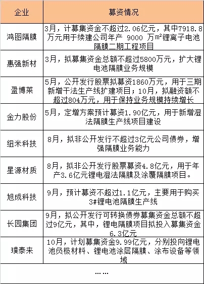 另一方面,已上市的隔膜公司幾乎都進(jìn)行了不同程度的募資,用于強化隔膜業(yè)務(wù),募資金額以億元規(guī)模為主。