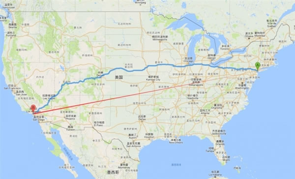 洛杉磯到紐約,被認(rèn)為是橫穿美國的經(jīng)典線路,地圖上,兩座超級都市的直線距離是2450英里(約合3951公里),開車的話,實際所走的距離是大約在2800英里左右(約合4500公里)。