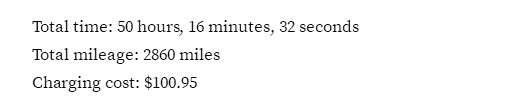 從里程表數(shù)據(jù)來看,全程走了2860英里(約合4602公里),SuperCharger充電站花費是100.95美元(約合656元),也就是平均約91公里/小時。