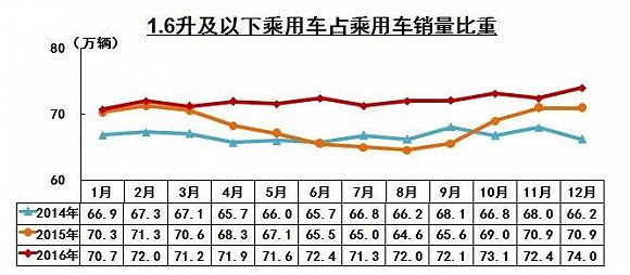 2017年1.6升及以下排量乘用車購置稅優(yōu)惠政策對于車市整體刺激有限。但根據(jù)中汽協(xié)2016年銷量數(shù)據(jù)來看,2016年1.6升及以下排量乘用車銷售1760.7萬輛,同比增長21.4%,高于乘用車總體增速6.5個百分點,占乘用車銷量比重為72.2%,比上年同期提高3.6個百分點。對乘用車銷量的貢獻度為97.9%。整體銷量走勢均高于2015年同期銷量,可以說購置稅的優(yōu)惠刺激性作用在2016年全年發(fā)揮明顯。這在某種程度上提前透支2017年小排量乘用車的銷量。