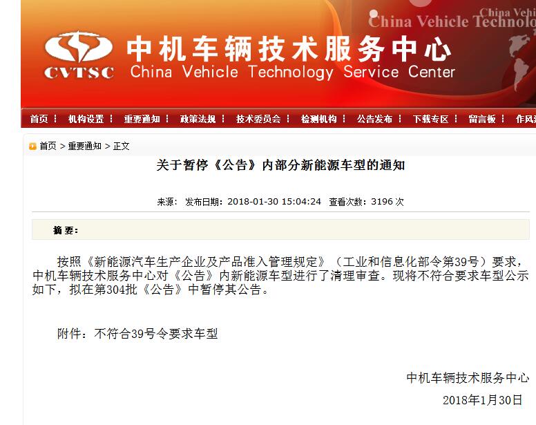 1月30日,中機中心網站發(fā)布關于暫?!豆妗穬炔糠中履茉窜囆偷耐ㄖ?。通知指出,按照《新能源汽車生產企業(yè)及產品準入管理規(guī)定》(工業(yè)和信息化部令第39號)要求,中機車輛技術服務中心對《公告》內新能源車型進行了清理審查?,F將不符合要求車型公示如下,擬在第304批《公告》中暫停其公告。