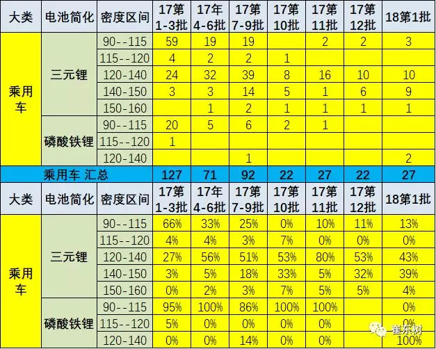以上為純電動且非快充的電池的特征。2018年純電乘用車的能量密度的提升也是較快,但2018年第1批乘用車車高于120的占到90%,140-150瓦的純電三元電池的達到9款。低能量密度的電池有所回升。而且本批的磷酸鐵鋰電池的車型也有出現(xiàn),能量密度表現(xiàn)120 ,也是能拿到正常補貼的。