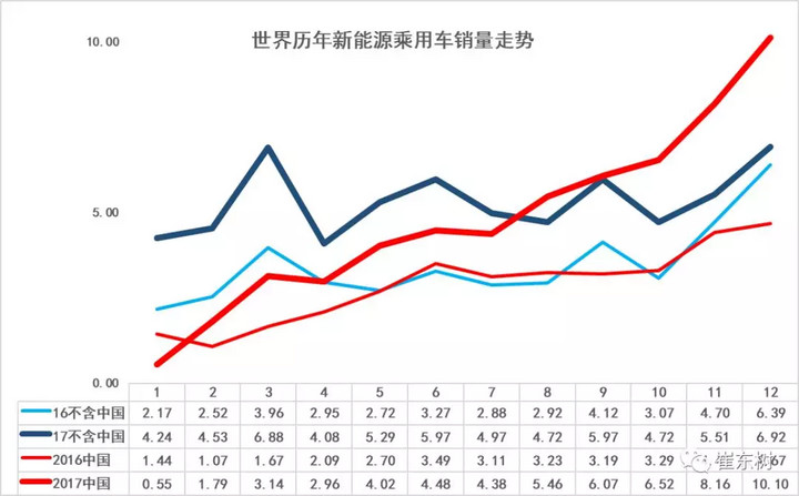 世界新能源車的走勢與中國的走勢差異較大,中國是汽車發(fā)展中市場,我們遠沒有達到飽和狀態(tài),因此波動很大。世界市場的走勢受到諸多因素影響