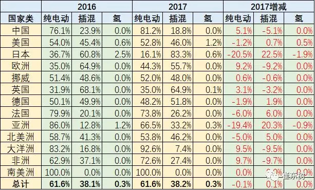 2017年世界新能源車的動力格局基本沒有變化,氫燃料仍是0.3%的微小數(shù)量,技術線路格局的插混和純電動基本保持穩(wěn)定。