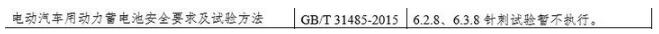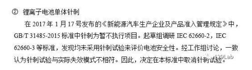 首先說一下準入管理,在其附件3的新能源汽車產品專項檢驗項目及依據(jù)標準里面,的確說明“針刺試驗暫不執(zhí)行”,但是原因不明。另外這是暫時不執(zhí)行,為什么是“暫時”,不是“永久”?將來可能會恢復針刺測試嗎?原因也不明。這一條理由似乎有點讓人不知所以然。