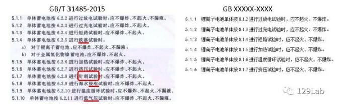 首先看一下GB單體電池的要求,過放、過充、短路、加熱、溫度循環(huán)、擠壓,一共五項安全測試,跟GB/T31485-2015的10項測試要求相比,減少了4項。其中,單體電池的針刺要求也在GB里面取消了(作為這么經典的電池安全測試方法之一,不知道取消的背后有什么故事)。