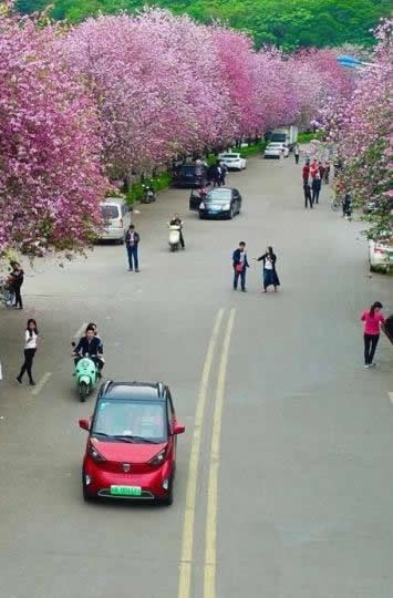 新能源汽車穿梭在柳州市花海中?!?/p>
