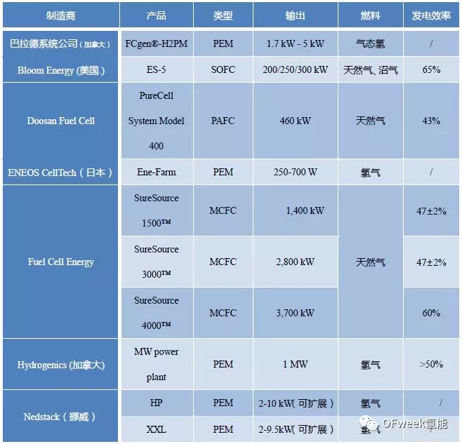 以上三家企業(yè)是固定式燃料電池的主要參與者,都推出了成熟的商業(yè)化產(chǎn)品,OFweek氫能將全球商業(yè)化固定式燃料電池型號匯總?cè)缦卤恚?/p>