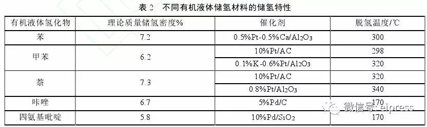 有機(jī)液體儲(chǔ)氫材料是利用不飽和有機(jī)物液體的加氫和脫氫反應(yīng)來(lái)實(shí)現(xiàn)儲(chǔ)氫。某些有機(jī)物液體可以可逆吸放大量氫,且反應(yīng)高度可逆、安全穩(wěn)定、易運(yùn)輸,可以利用現(xiàn)有加油站加注有機(jī)液體。目前,常用儲(chǔ)氫的有機(jī)液體包括苯、甲苯、萘、吡啶及乙基咔唑等(表2)。傳統(tǒng)的有機(jī)物(苯、甲苯、萘)的質(zhì)量?jī)?chǔ)氫密度已達(dá)到規(guī)定標(biāo)準(zhǔn),質(zhì)量?jī)?chǔ)氫密度在5.0%~7.5%,但反應(yīng)壓力在1.0~10.0MPa,反應(yīng)溫度在350℃左右,需要貴金屬催化劑??梢?jiàn),有機(jī)液體儲(chǔ)氫技術(shù)操作條件較苛刻,導(dǎo)致該儲(chǔ)存技術(shù)成本高、壽命短。