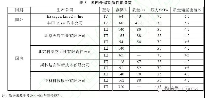 從各種儲(chǔ)氫技術(shù)目前應(yīng)用情況來(lái),其均已在車(chē)載中有應(yīng)用,但是中國(guó)的技術(shù)水平與國(guó)外還存在一定的差距:①?lài)?guó)外乘用車(chē)已經(jīng)開(kāi)始使用質(zhì)量更輕、成本更低、質(zhì)量?jī)?chǔ)氫密度更高的IV型瓶,而中國(guó)IV型瓶還處于研發(fā)階段,成熟的產(chǎn)品只有35MPa和70MPa的III型瓶(表3),其中70MPa的III型瓶在乘用車(chē)樣車(chē)上應(yīng)用。②中國(guó)制造的III型瓶的主要原材料碳纖維仍依賴(lài)進(jìn)口。由于中國(guó)研發(fā)起步晚、原材料性能差等原因,中國(guó)生產(chǎn)的碳纖維還不能滿(mǎn)足車(chē)用氫瓶的要求,主要依賴(lài)進(jìn)口。③國(guó)外液氫儲(chǔ)罐已在汽車(chē)上應(yīng)用,而中國(guó)還未實(shí)現(xiàn)。通用汽車(chē)、福特汽車(chē)、寶馬汽車(chē)等都推出使用車(chē)載液氫儲(chǔ)罐供氫的概念車(chē),但中國(guó)可以自行生產(chǎn)液氫,但尚未將其應(yīng)用于車(chē)載氫系統(tǒng)。